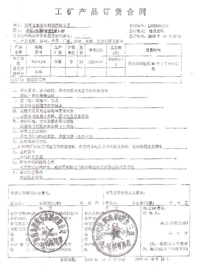 2008年10月28日中國人民解放軍總參三部物資處3名解放軍干部來我公司實(shí)地考察??疾毂容^后對(duì)我公司的規(guī)模和產(chǎn)品給予了極大的肯定,并就一直聯(lián)系的要購買的25臺(tái)鋁合金升降機(jī)簽訂了訂貨合同。現(xiàn)我公司已按照約定如期交貨,總參三部驗(yàn)收后非常滿意,并已全部付款到位。