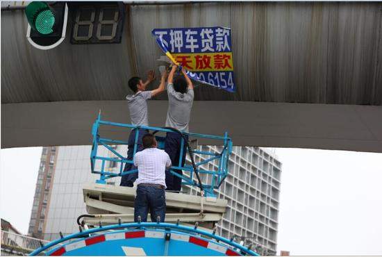 目測人行道過街天橋橋身垂直距離地面8米,100cm*80cm見方的藍色 “牛皮鮮”上印著車貸廣告。關(guān)注到這些廣告的市民都在猜:“這么高的天橋,牛皮蘚是么樣貼上去的?”據(jù)青山城管“三亂”整治專班負(fù)責(zé)人介紹,友誼大道兩座天橋東南西北四個方向的紅綠燈旁均被貼上了同一內(nèi)容的“牛皮癬”,應(yīng)該是前天晚上(11日)干的,估計有兩種方式張貼:一是借助比較高的車身站立進行,這需要大型車輛配合;二是腰系安全帶從橋面懸垂下去,這很簡單,但是很危險。不管是怎么貼上去的,只要發(fā)現(xiàn)一處,就清理一處,這點事難不倒我們。有困難找龍豪升降機,除了及時清理外,還將對當(dāng)事人展開調(diào)查,依法進行處置。